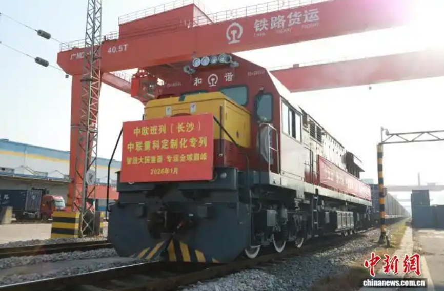 1月21日,满载高端装备的中欧班列(长沙)“中联重科”定制化专列等候发车。林依摄多位受访者表示,面对全球市场需求的多样化与专业化,中国工程机械企业出海逻辑已从“有什么卖什么”转向“市场需要什么就量身定制什么”。